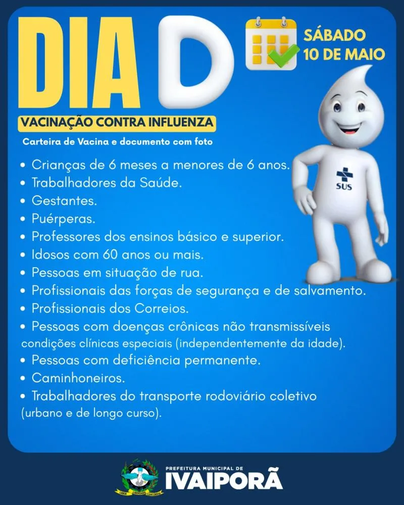 A cidade de Ivaiporã promove neste sábado, dia 10 de maio, o Dia D de Vacinação contra a Influenza (gripe). A ação tem como objetivo ampliar a cobertura vacinal entre os grupos prioritários definidos pelo Ministério da Saúde.