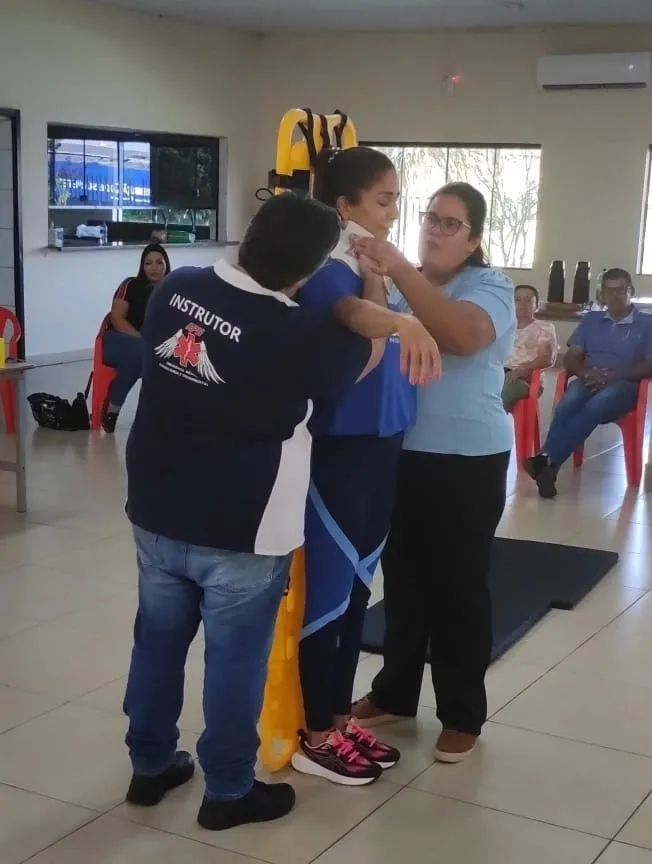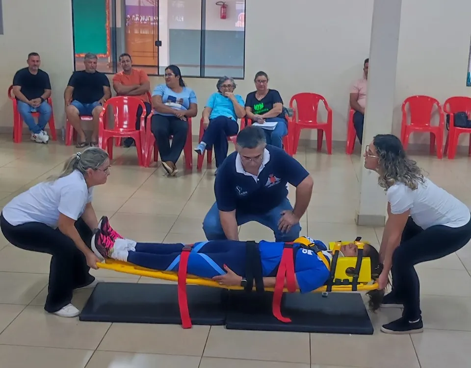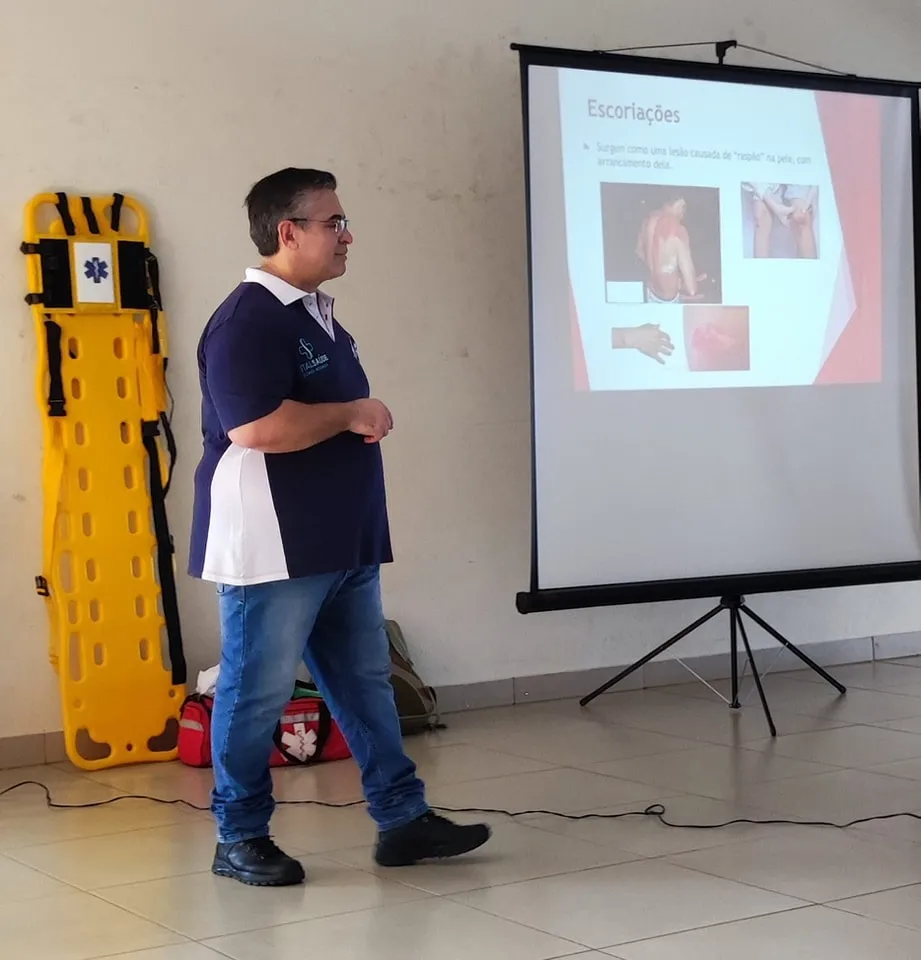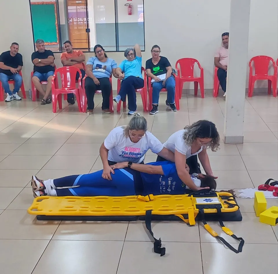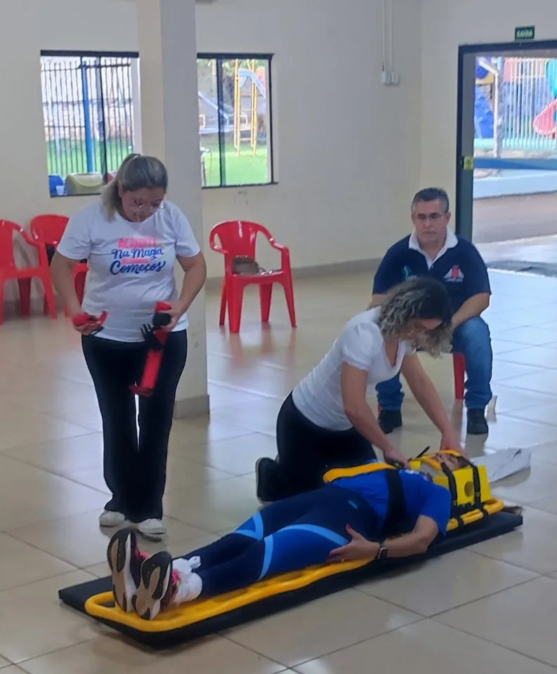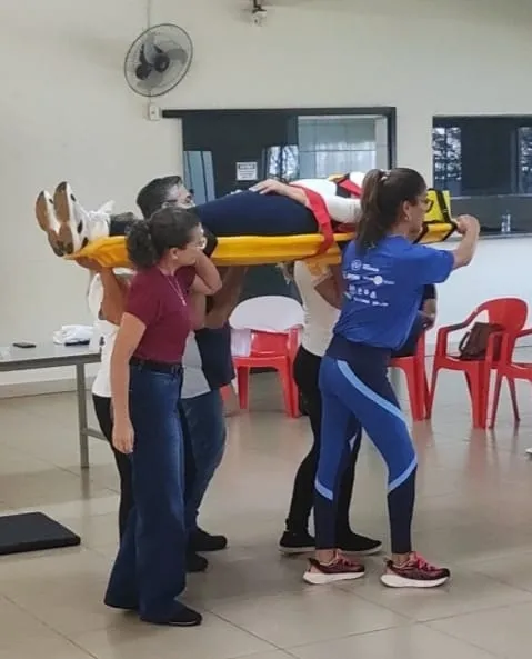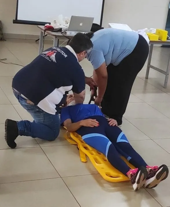 Nesse primeiro dia, foram abordados diversos temas essenciais, como: noções básicas de anatomia e fisiologia, materiais e equipamentos utilizados, biossegurança, EPIs, abordagem inicial e secundária, colocação de colar cervical, parada cardiorrespiratória, parada respiratória, reanimação cardiopulmonar, traumas, imobilização de fraturas e luxações, imobilização em prancha, rolamentos de emergência (90° e 180°), hemorragias, entre outros.