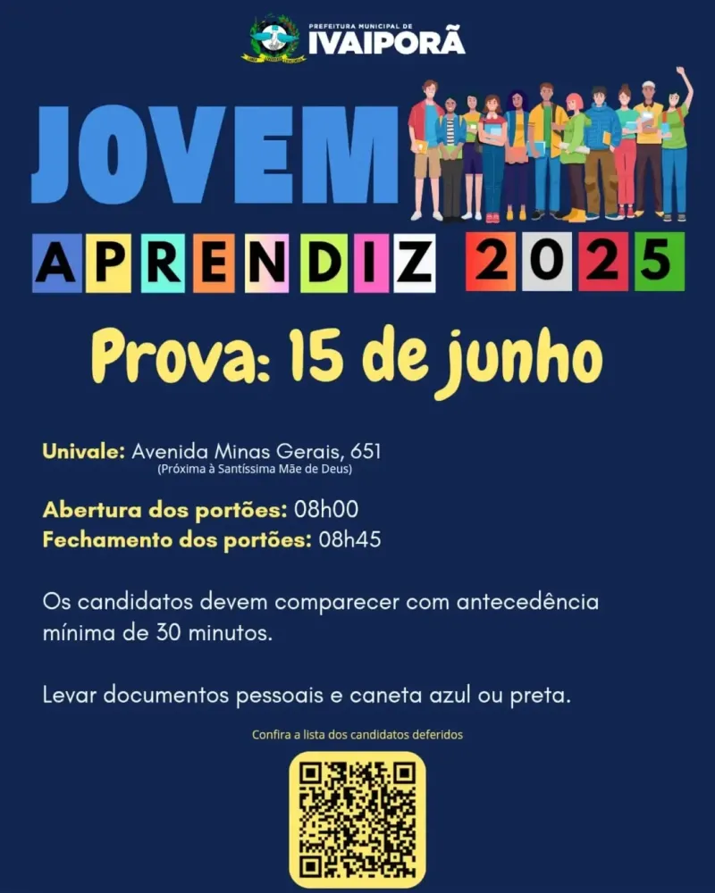 A Prefeitura Municipal de Ivaiporã divulgou os detalhes da prova do programa Jovem Aprendiz 2025, que será realizada no próximo sábado, 15 de junho, na sede da Univale, localizada na Avenida Minas Gerais, nº 651, próxima à Igreja Santíssima Mãe de Deus. A orientação é que os candidatos cheguem com pelo menos 30 minutos de antecedência, portando documento pessoal com foto e caneta esferográfica azul ou preta.